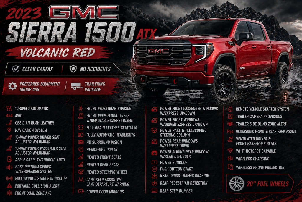 This 2023 GMC Sierra 1500 AT4X, finished in stunning Volcanic Red, delivers the perfect blend of rugged off-road capability and premium luxury. Powered by a 6.2L V8 engine producing 420 horsepower, it offers impressive performance both on and off the road. The AT4X package features advanced off-road hardware like front and rear locking differentials, Multimatic suspension, and a factory lift, while the interior provides a high-end experience with full-grain leather seating, heated and ventilated seats with massage, a large touchscreen infotainment system, and premium Bose audio. With bold styling, cutting-edge technology, and trail-ready capability, this Sierra AT4X stands out as a top-tier truck built for any adventure.